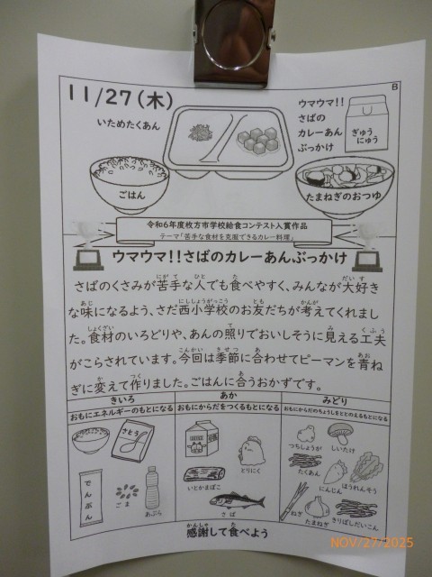この「ウマウマ!さばのカレーあんぶっかけ」は、昨年度の枚方市学校給食コンテストで入賞した枚方市立さだ西小学校の児童が考えた作品です。