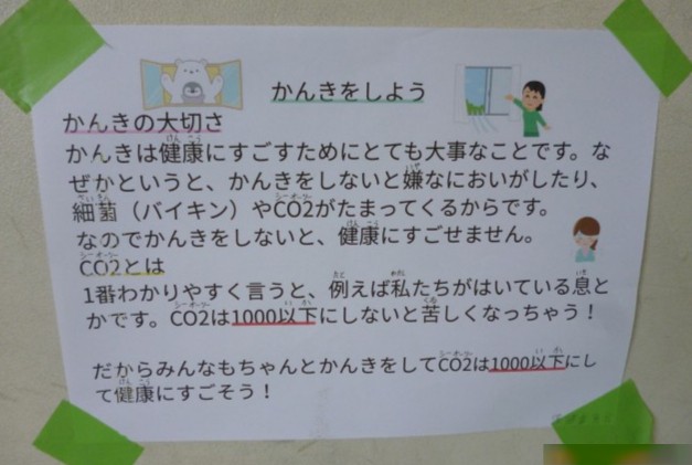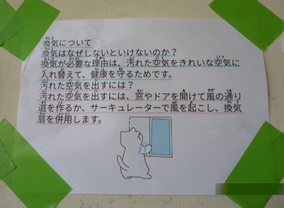 ということで、保険委員さんが換気キャンペーンをしています。休み時間には「窓を開けましょう。」という声がけ、そして、換気についてのポスターです。どうして換気が必要なのかなども、タブレット端末で作成しました。