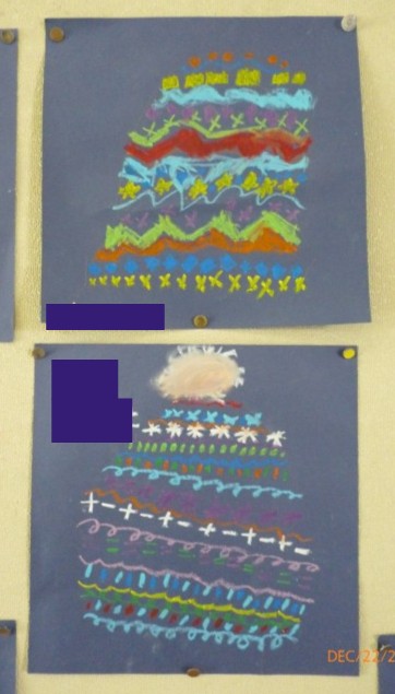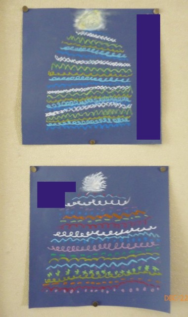 クレパスでさまざまな線を順に描いていくことで、かわいい帽子ができました。カラフルな帽子に体も心もあったかくなっちゃいますね。