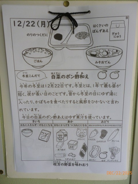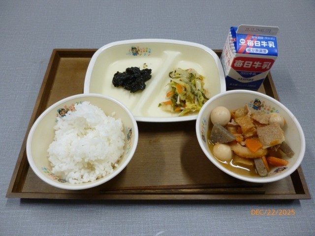 今日の給食の献立は、「ご飯・みそおでん・白菜のポン酢和え・のりの佃煮・牛乳」です。