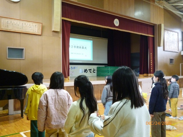 校長からは2学期の子どもたちのがんばりと冬休みのお願いを伝えました。2学期はさまざまな行事の中で一生懸命がんばる子どもたちの姿をたくさん見ることができました。そんな子どもたちと過ごすことができて、とても楽しい2学期でした。