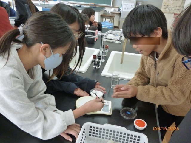 食塩とミョウバンを水に溶かす実験です。薬品を使う実験では、必要量をきっちり測ることが大切です。できるだけ正確な結果を出すために、グループで役割分担をして、実験に臨んでいます。やっぱり実験が楽しいですね〜。理科離れとよく言われていますが、私たち教員が授業の中で理科のおもしろさを伝えていきたいものです。