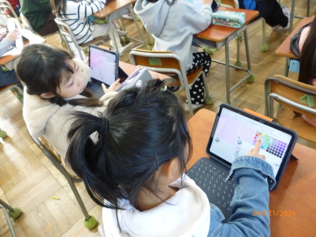 今日は2年生のクラスでビスケットという子ども向けのプログラミング学習サービスを活用して、プログラミングの基礎を学びました。少しやり方を知るだけで、アニメーションなどを簡単につくることができます。子どもたちの理解スピードのはやいこと、はやいこと! タブレット端末といったデジタル関係は、現代に生きる子どもたちには敵いません! ICT支援員さんの力もかりて、新しいことを楽しく学んだ2年生の子どもたちです。
