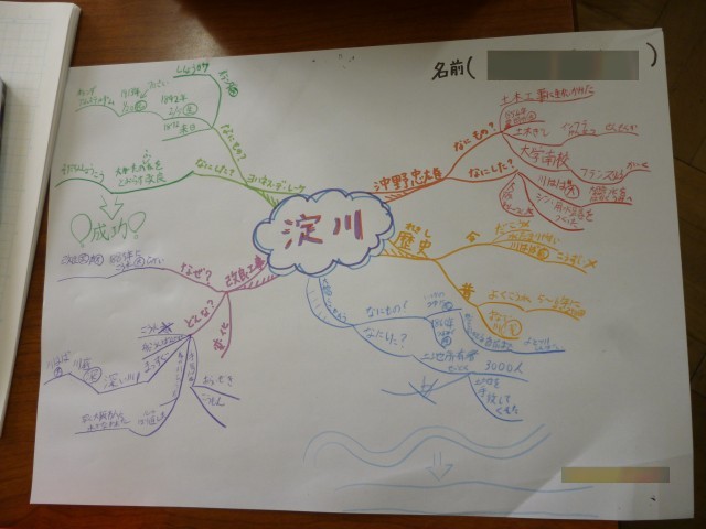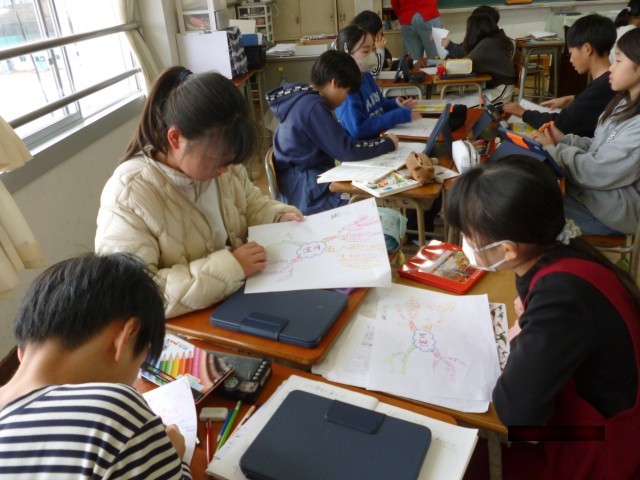 4年生はまだマインドマップを使うことが少ないので、戸惑っている人もいましたが、友だちの書いたものを参考にしたりしながら、頭の中にある学びをまとめていました。