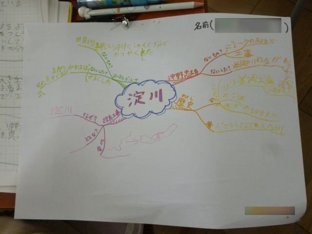 淀川について学習したことをまとめ、発表をします。調べたことを整理するために、マインドマップを使いました。淀川に関する言葉を思い出しながら、つないできます。そこから新たな言葉を加えていき、マインドマップを見ると、自分の発表したいことやプレゼンにまとめたいことが明らかになってきます。