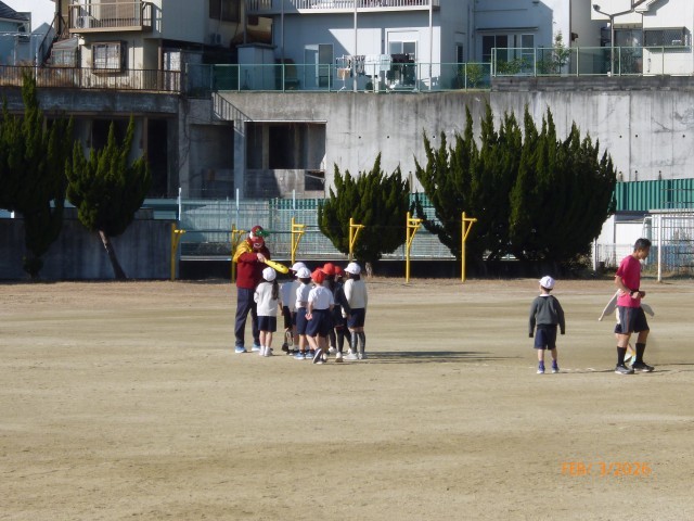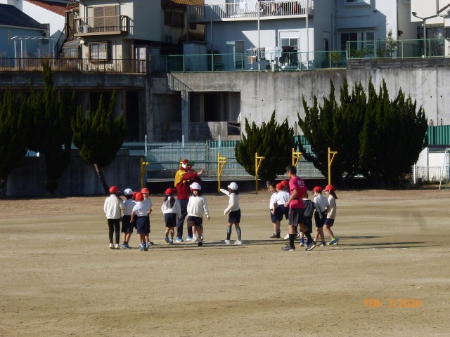 1年生の担任が鬼に扮して、子どもたちと体育をしていました。集合した後には早速、「鬼ごっこ」をしたようです。確かに、これこそホンモノの「鬼ごっこ」ですね。