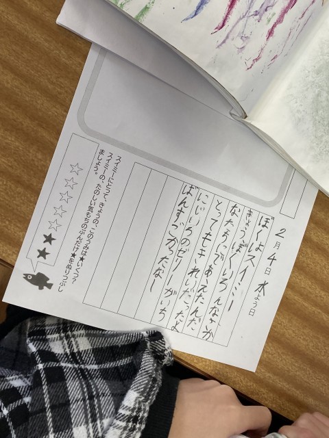時間の最後には、スイミーになりきって日記を書くことに挑戦しています。自分がスイミーだったら、どんな日記を書くかな。