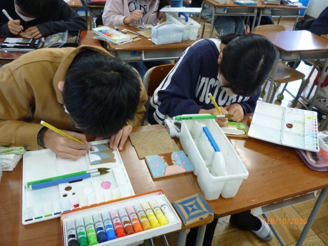 図工の時間に卒業記念のオルゴール製作をしています。デザインを考え、それを彫刻刀で彫り、色付けをします。あまりに真剣に取り組んでいるので、なかなか声がかけられない・・・。