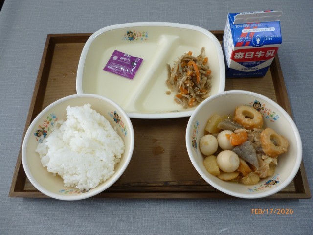 今日の給食は、「ご飯・みそおでん・じゃこ入りきんぴら・ゆかりふりかけ・牛乳」です。