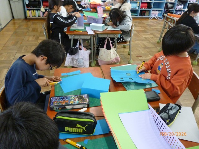 カッターナイフを使うのは初めての2年生です。かなりドキドキしながら、慎重に、緊張感をもって手にしています。カッターナイフが使えるようになると、図工の世界も広がります。いろいろな道具を上手に使えるようになることも大切ですね。