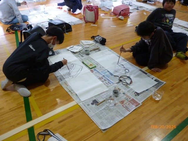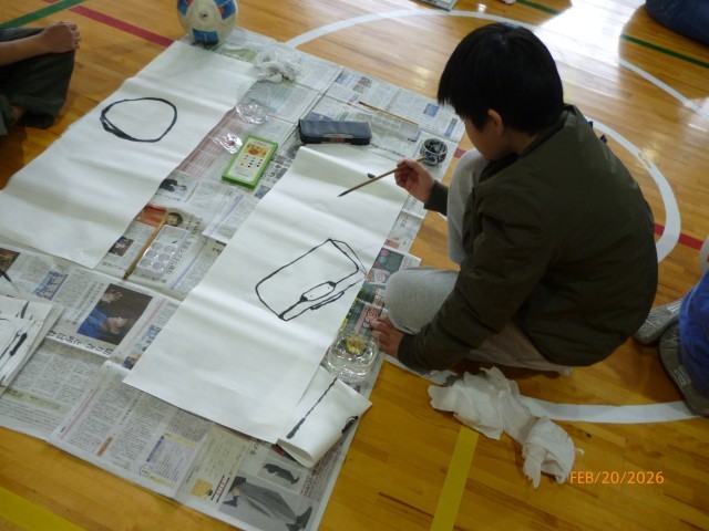今日は、6年生全員で、教室から体育館に場所を変えて、大きな和紙にかきますよ! 筆の持ち方は、どうだったかな。「やっぱり腕が・・・。」となっている人、多数。手がふるえたことで揺らいだ線がそれはそれでいい味出しています。