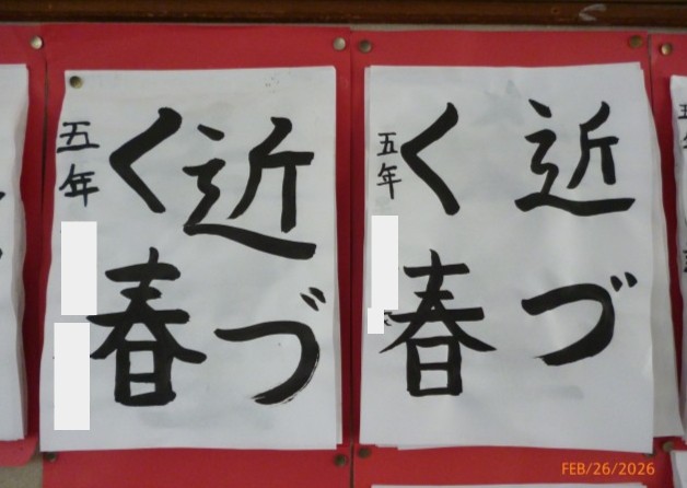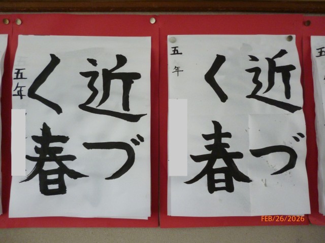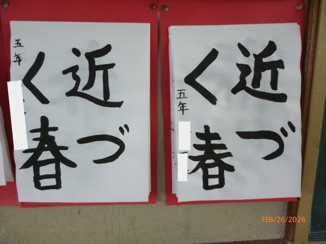 5年生が毛筆で書いた言葉は「近づく春」です。ここ数日は気温も上がり、あたたかいですが、また寒い日がくるのではないか!?と思ってしまいます。(例年、卒業式の練習が始まると、冬に逆戻りすることが多いな、と感じるのです。)