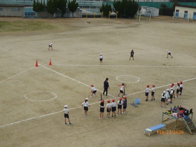 3年生がティーボールに挑戦していました。バッティングティーに置かれたボールをよく見て、バットで打ちます。ボールが止まっているとはいえ、遠くまで飛ばすのはなかなかの難しさがあります。
