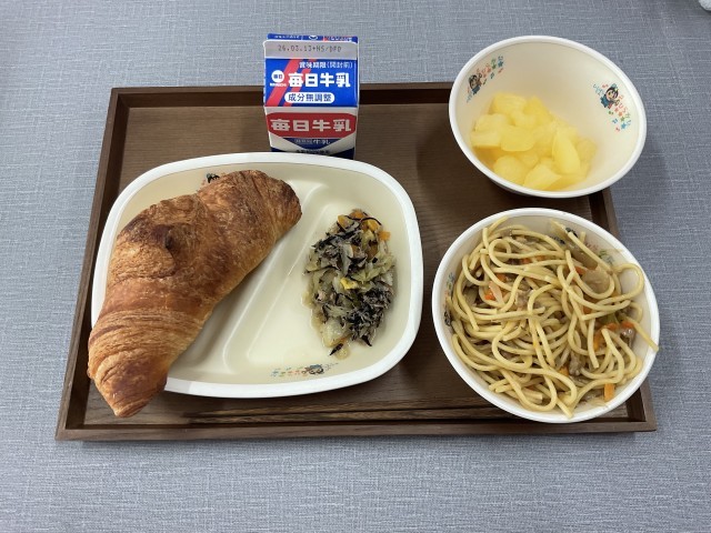 今日の給食は、「クロワッサン・和風スパゲティ・ひじきサラダ・りんごのかんづめ・牛乳」です。