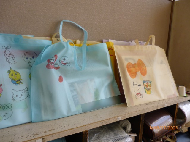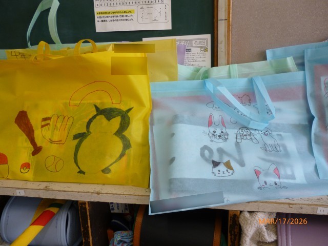 そうです、作品バッグです! このふくろが教室に置かれていたり、フックにかけられているのを見ると、「あー、今年度が終わるなあ・・・。」と感じます。