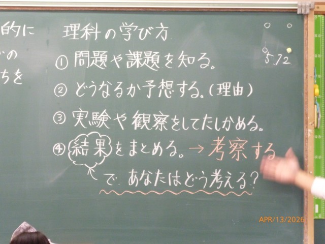 特に、実験や観察の「結果」から、自分はどう考えるか。「考察する」ことの大切さを強く言われていましたね。この「考察する」がなければ、理解は深まりません。また、新しい学びにもつながりません。ぜひ、実験や観察の「結果」を確認して、そこからわかったこと、考えられることを自分の言葉で説明できるようになってほしいです。それが理科のおもしろさですよ!