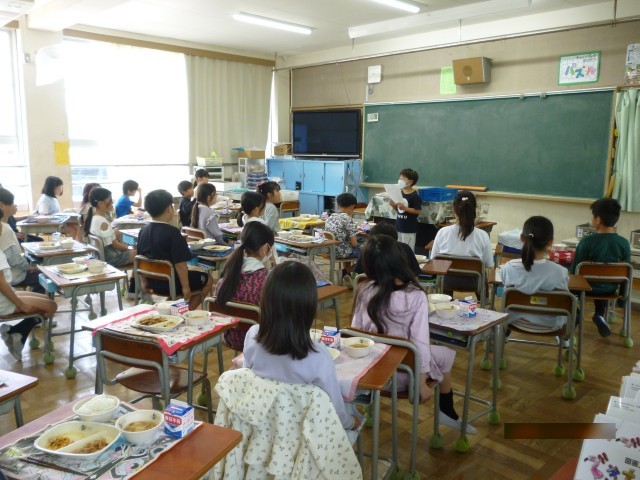 香陽小学校の給食は、春日小学校の調理場から運ばれてきます。4時間目の授業が終わると、子どもたちは配膳室に給食を取りに来ます。配膳室では、「○年○組○番(←各クラスにつけられた食缶番号)です。いただきます!」と言って、食器や食缶を受け取ります。