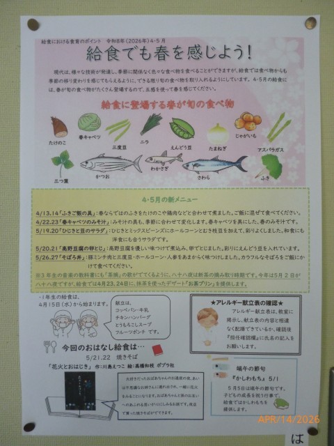 この配膳室でのあいさつが年度初めは注意!なのです。なぜなら、思わず前年度の学年やクラス、食缶番号を言ってしまうからです! 思いっきり大きな声で前年度の学年を言ったり、食缶番号が??になってしまったりと、子どもたちの「あっ、まちがえちゃった!」というかわいい表情を見ることができたりします。その度に「前の学年にもどっちゃいますか?」と声をかけている校長です。(笑)