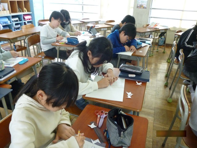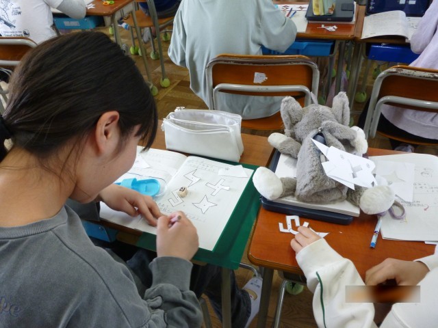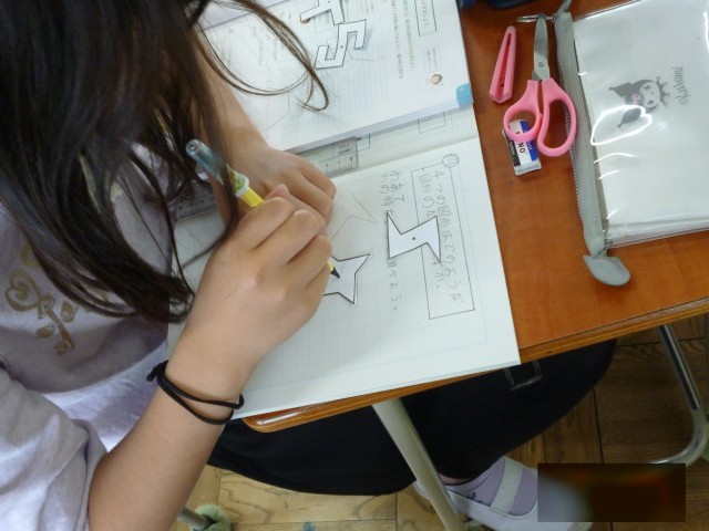 6年生の子どもたちが真剣に顔で図形とにらめっこをしていました。実際の図形を切ったり、書いたりして、その図形の特長を調べています。