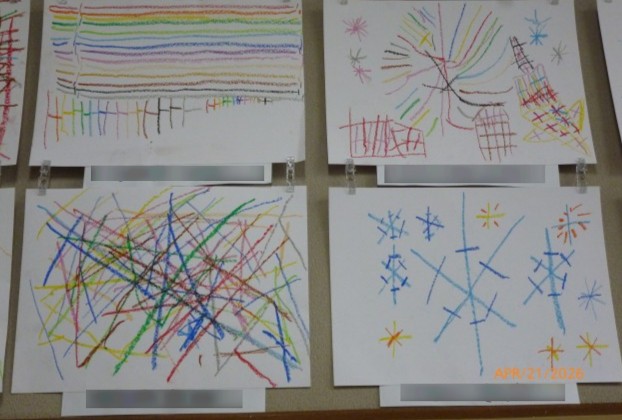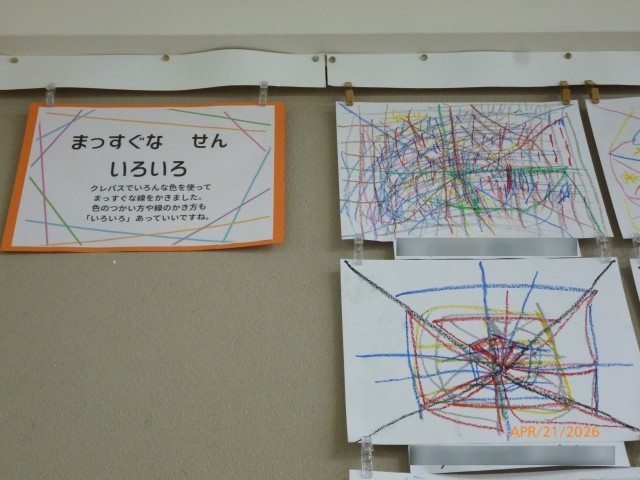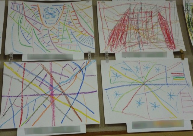 1年生の初めての図工の作品は、クレパスを使って、まっすぐな線をさまざまに描きました。