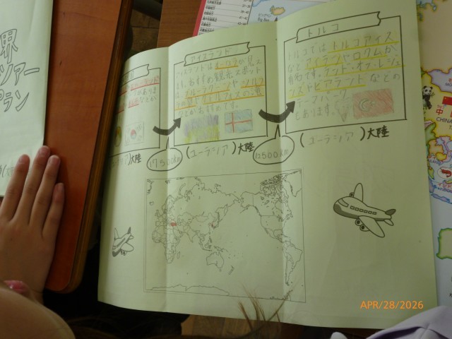 5年生では、さらに広がり日本全体の国土について、そして、世界の中の日本という視点で学習していきます。「世界」のことをどれくらい知っていますか。地球儀や地図帳で世界を見て、「世界ツアープラン」にまとめました。どこの国の、どんなことに注目しましたか。