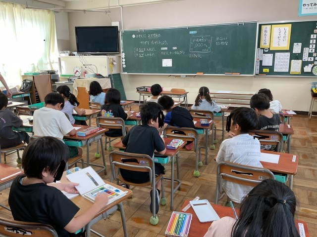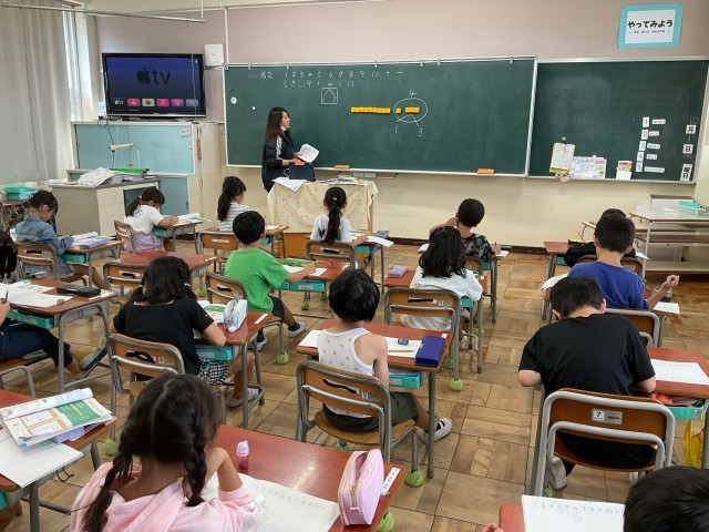 1年生の授業の様子です。算数の計算学習をしています。隣りのクラスでは、「かぞくにおすすめのサラダをプレゼントしよう」の学習で、どんなおすすめのサラダができるかな?