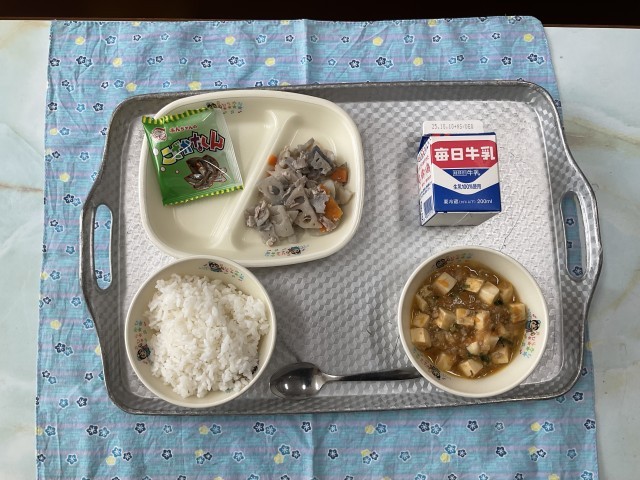 今日の献立・・・マーボー豆腐、レンコンの中華和え、ミニフィッシュ、ご飯、牛乳です。