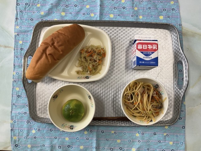 今日の献立・・・きのこのスパゲティ、ささみとキャベツのソテー、みかん、コッペパン、牛乳です。