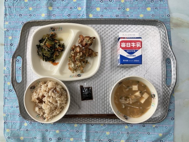 今日の献立・・・味噌汁、お好み揚げ、小松菜とツナの和え物、小袋ソース、かやくご飯、牛乳です。