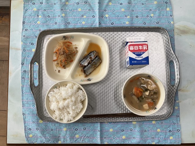 今日の献立・・・こしね汁、さんまの生姜風味、春雨の炒め物、ご飯、牛乳です。