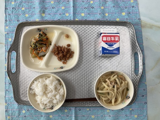 今日の献立・・・きつねうどん、白菜のポン酢風味、じゃこまめ、ご飯、牛乳です。