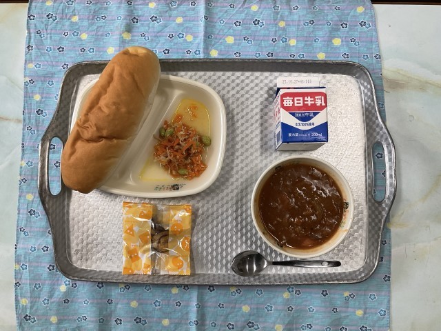 今日の献立・・・ハッシュドポーク、ささみと人参のサラダ、さつまいもチップス、コッペパン、牛乳です。