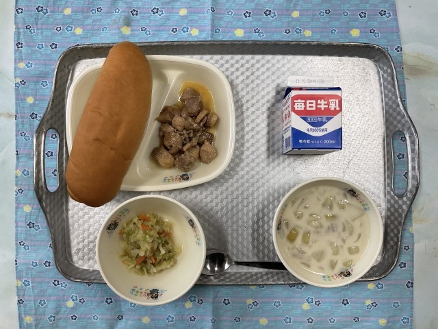 今日の献立・・・さつまいものクリームスープ、鶏肉のマーマレード焼き、キャベツのソテー、コッペパン、牛乳です。