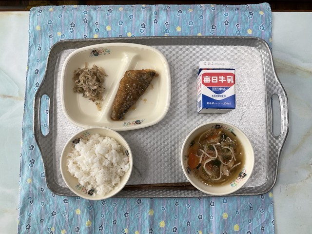 今日の献立・・・玉ねぎのお汁、あげさわらの味噌味、炒めたくあん、ご飯、牛乳です。