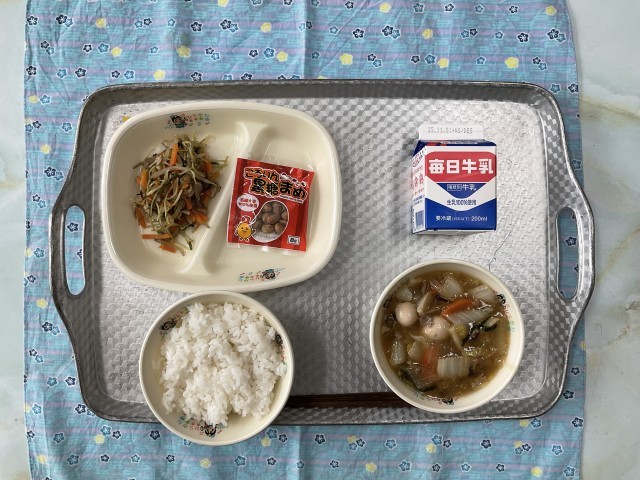 今日の献立・・・うすら卵入り八宝菜、豆苗の炒め物、黒糖ビーンズ、ご飯、牛乳です。