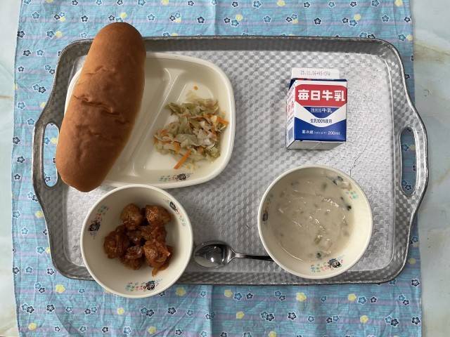 今日の献立・・・いんげん豆のクリームスープ、肉ボール、ラハノサラダ、コッペパン、牛乳です。
