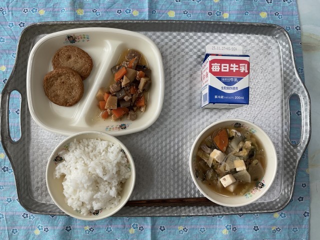 今日の献立・・・冬野菜なべ、じゃこ天、筑前煮、ごはん、牛乳です。