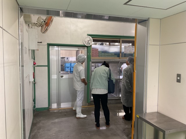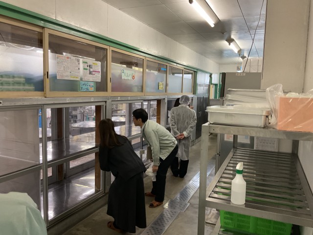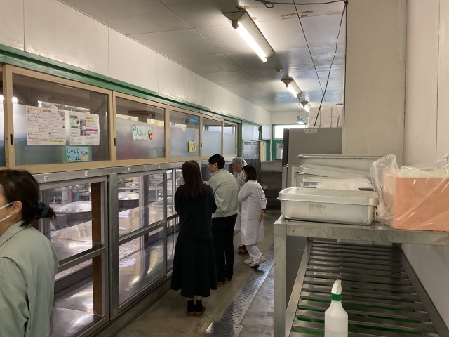 今日の午後2時過ぎから、給食調理場の視察ということで、他校での視察終了後、教育長・副教育長・総合教育部長・おいしい給食課長が本校の給食調理場に来られ、本校の栄養管理士・給食調理場長が調理場の説明等を行いました。