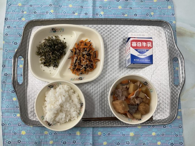 豚肉と大根の煮物、ささみと人参の甘酢あえ、大根葉に炒り煮、ご飯、牛乳です。