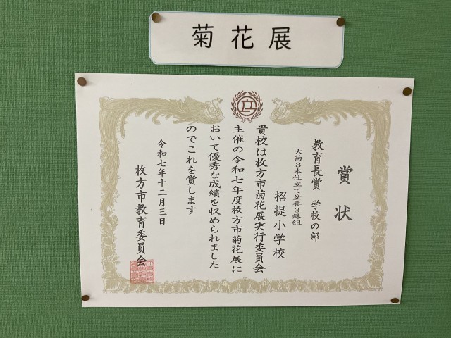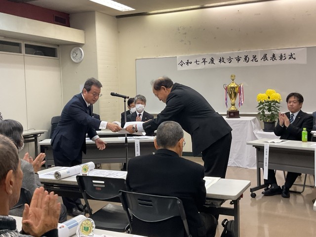 12月3日には、令和7年度枚方市菊花展表彰式がありました。今年度は「枚方市教育長賞」を受賞しましたので、谷元教育長から表彰状をいただきました。現在も玄関入り口には、大菊3本仕立て盆養の鉢を置いて下さっております。