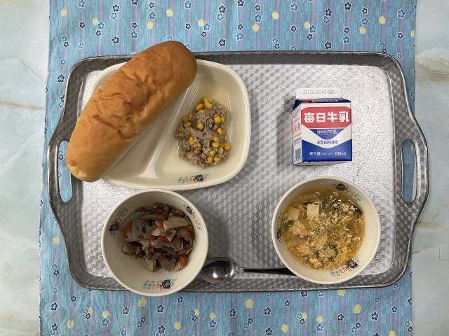今日の献立・・・サンラータン、ツナコーン、エリンギの炒め物、コッペパン、牛乳です。