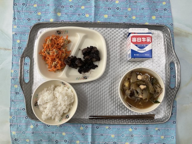 今日の献立・・・すき焼き、人参シリシリ、あずき餅、ご飯、牛乳です。