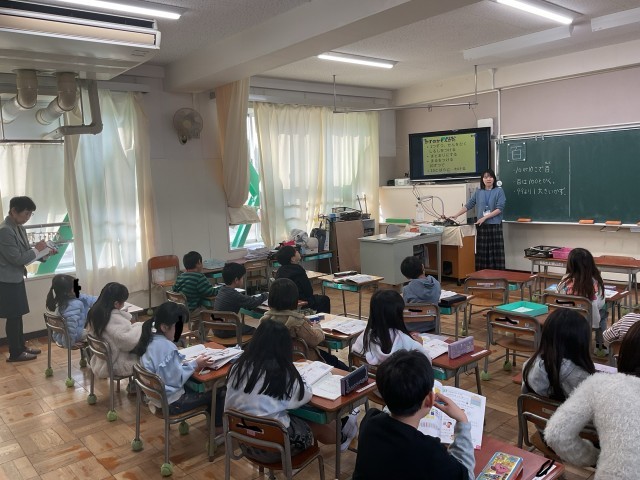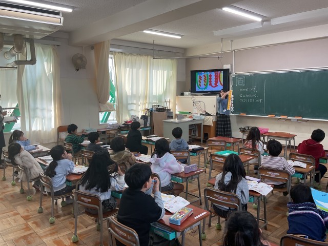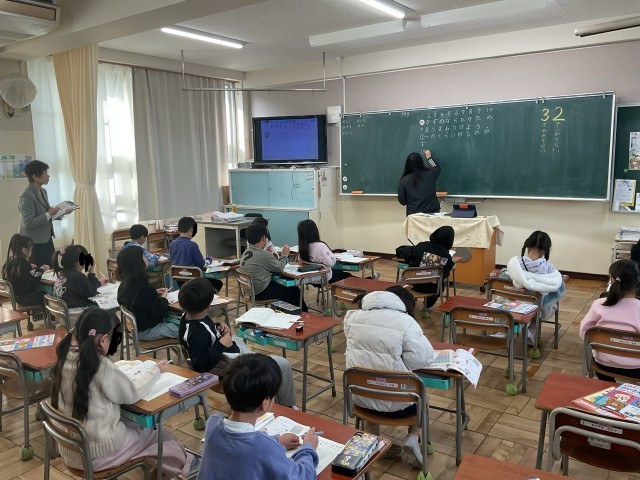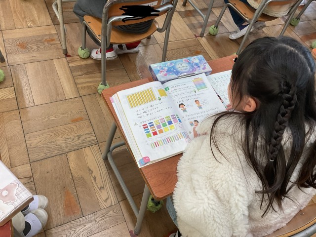 今日の2限目には、教育委員会から1年生の授業の様子を見学に来られました。1・2組との算数の授業で、数の表を使って子どもたちは学習していました」。子どもたちの真剣に取り組む様子を見ていただきました。