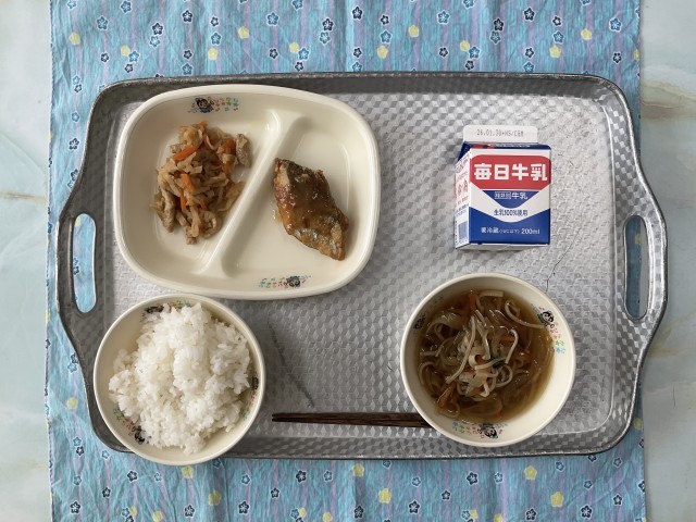 今日の献立・・・玉ねぎのお汁、揚げサワラの味噌味、切り干し大根の煮物、ご飯、牛乳です。