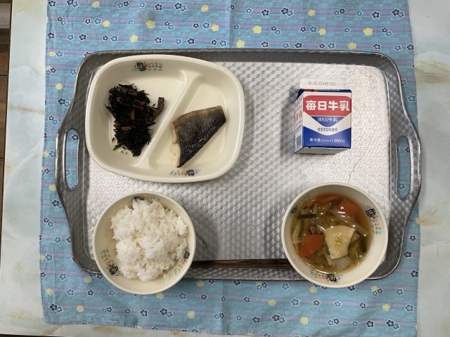今日の献立・・・せんべい汁、焼き魚(ほっけ)、ひじきの炒め煮、ご飯、牛乳です。