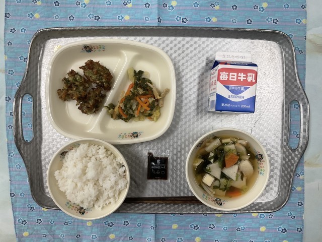 今日の献立・・・すまし汁、お好み揚げ、大阪白菜の煮浸し、小袋ソース、ご飯、牛乳です。