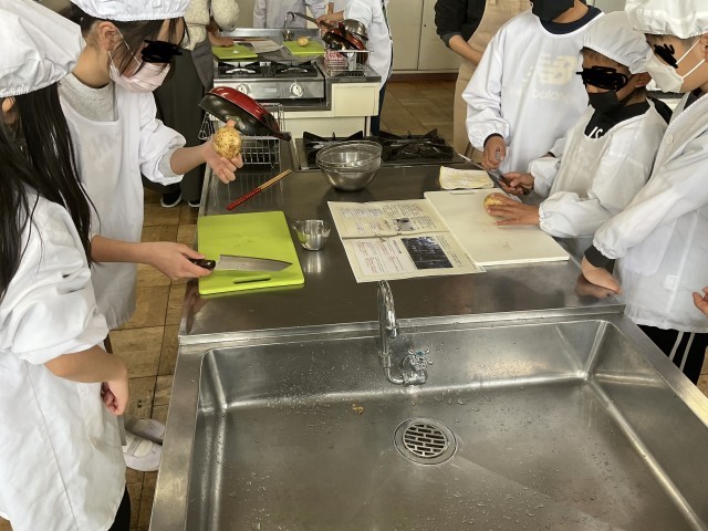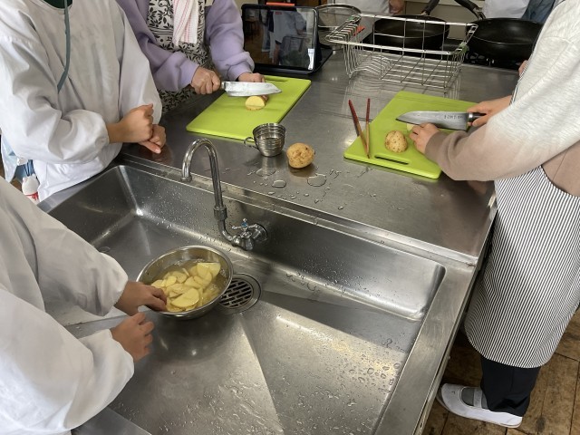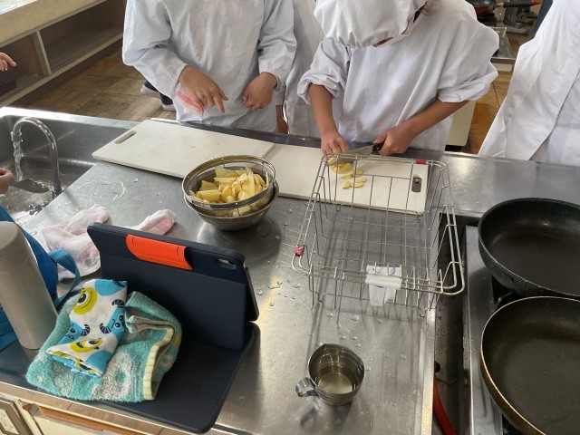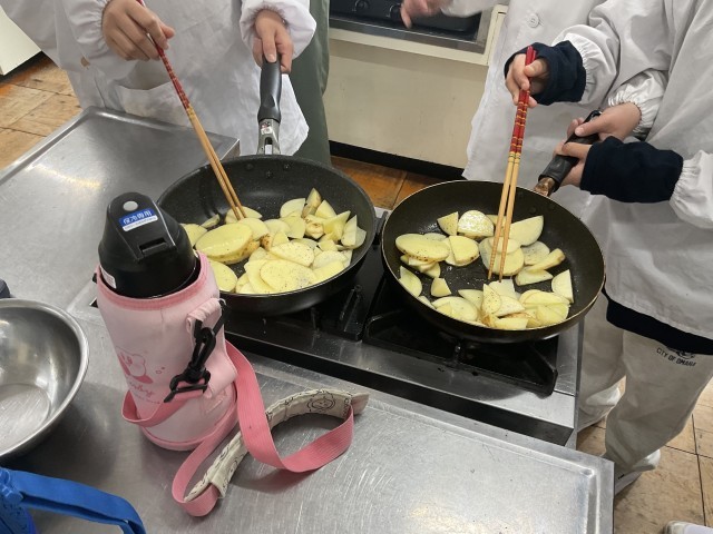 4年生は、自分たちで収穫したジャガイモを、昨日、今日とそれぞれのクラスで調理実習を行いました。慣れない包丁捌きの中、真剣に丁寧にジャガイモを切って、炒めていました。きっと、自分たちで収穫したジャガイモ料理は、格別なものとなったことでしょう。子どもたちの中には「この調理実習で、お家の人の料理作りの苦労がわかった」という感想もありました。