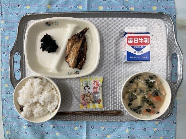 今日の献立・・・かす汁、年越しのイワシ、海苔の佃煮、いり大豆、ご飯、牛乳です。