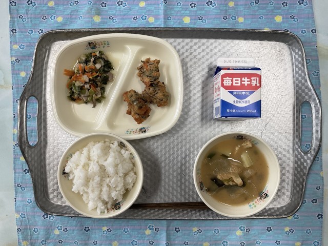 今日の献立・・・味噌汁、けんちん揚げ、白菜の塩麹炒め、ご飯、牛乳です。