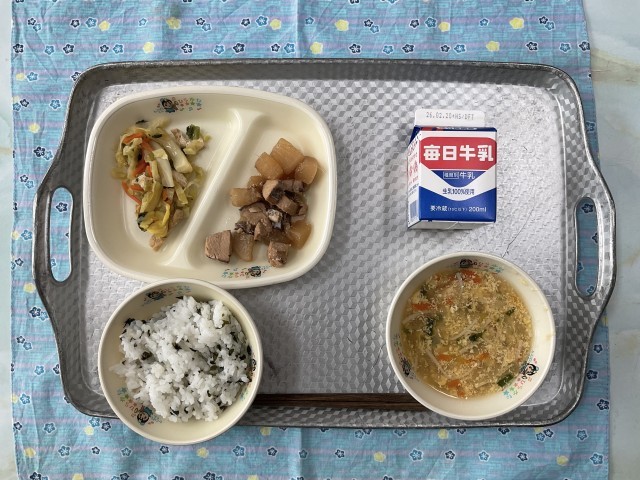 今日の献立・・・かき玉汁、ぶり大根、煮びたし、わかめご飯、牛乳です。